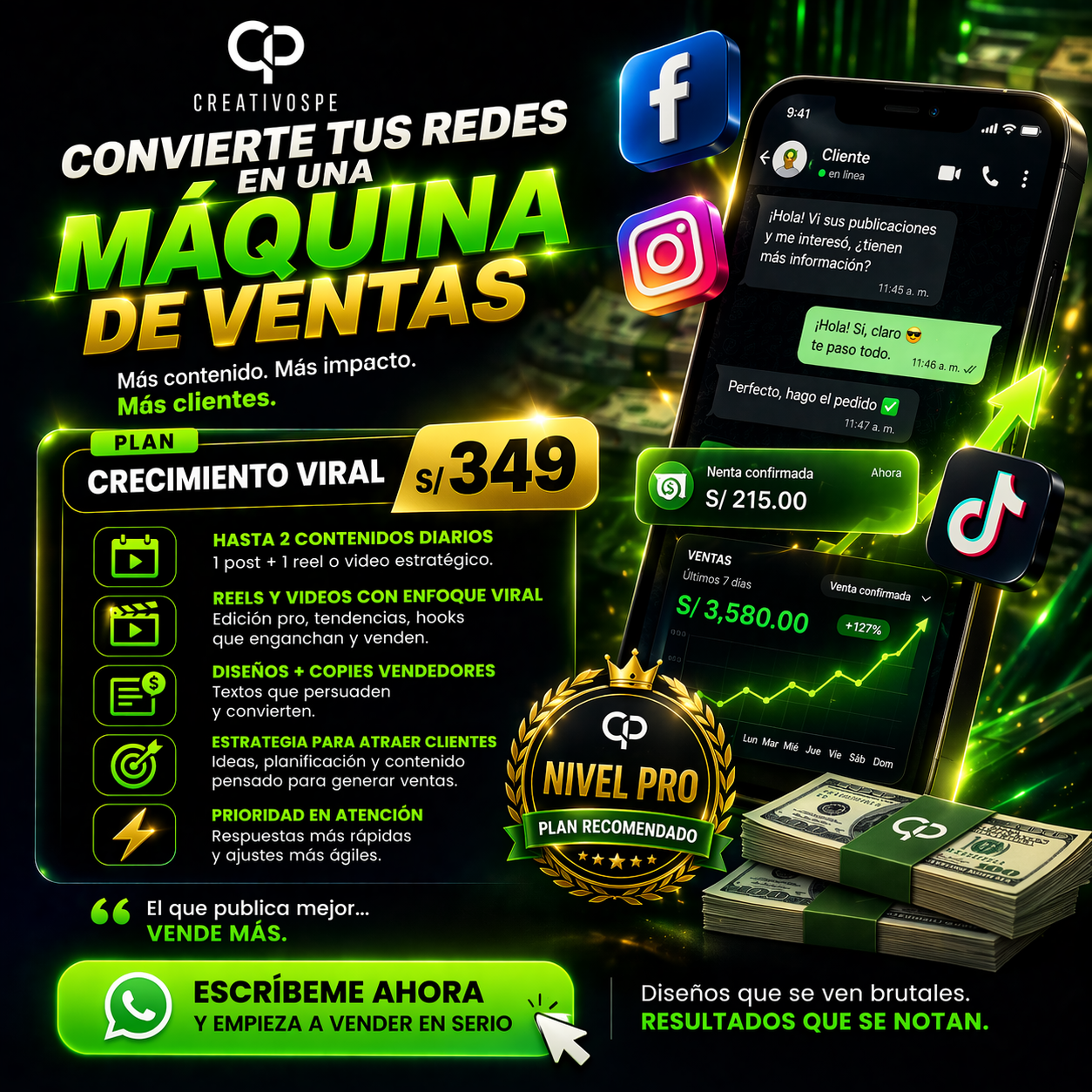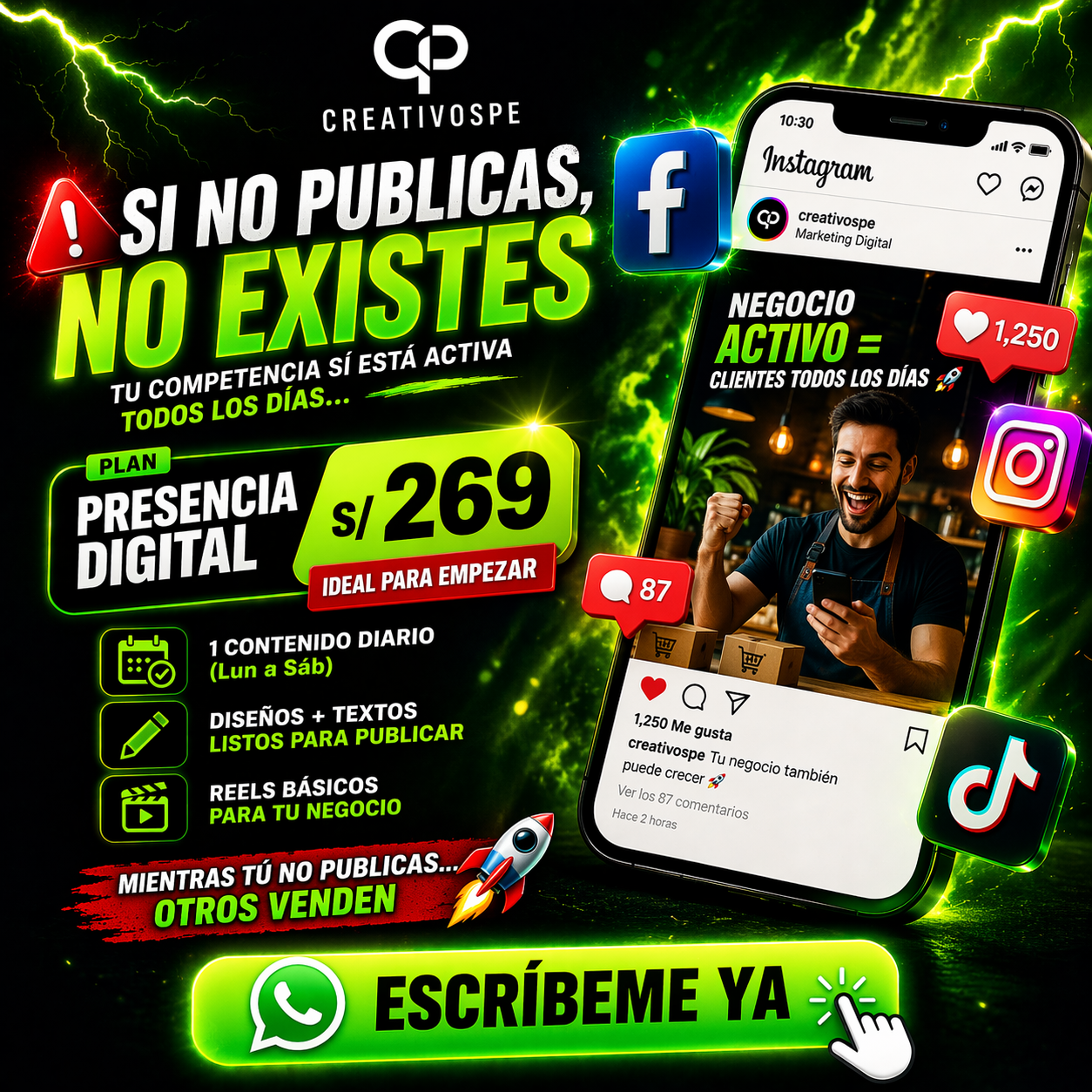 En CreativosPe ayudamos a negocios a crecer con estrategias digitales que realmente generan resultados. Creamos contenido, diseño y presencia online para que tu marca destaque y venda.